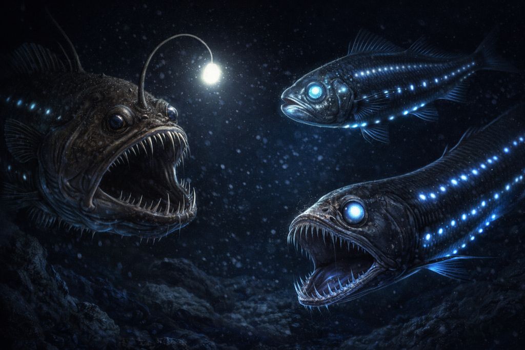Удильщик — классический пример: его светящийся «фонарь» служит приманкой в абсолютной тьме.