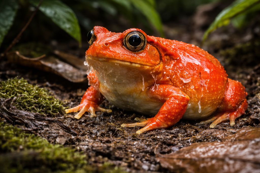 Их яркая красно-оранжевая окраска — не «декор», а часть защитной стратегии. Такой цвет хорошо заметен на фоне тёмной подстилки и может работать как предупреждающий сигнал о «неприятности» добычи. При опасности лягушка-помидор часто не убегает далеко, а старается удержаться на месте и включить химическую защиту.