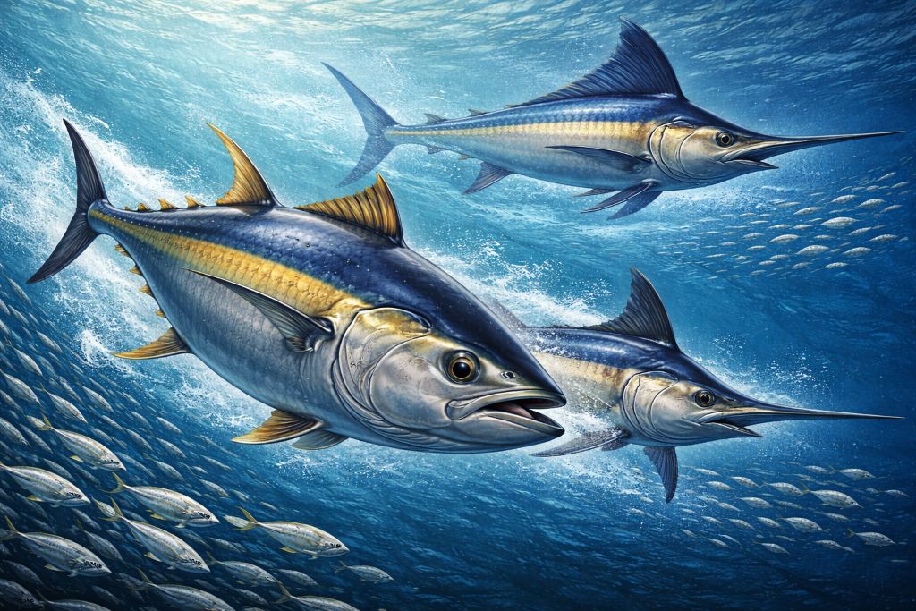 Открытый океан — пространство без укрытий. Здесь невозможно спрятаться за камнем или растением, и выживает тот, кто быстрее, выносливее и точнее. Именно поэтому в пелагиали — толще открытых вод — появились особые хищники, способные развивать огромную скорость. Тунец, рыба-меч, марлины и некоторые акулы стали настоящими болидами океана, превратив движение в главное оружие.