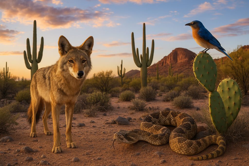Аризона — это царство солнца, песка и скал, где орлы парят над каньонами, койоты воют под звёздами, а ящерицы замирают на раскалённых камнях, сливаясь с огненной землёй.