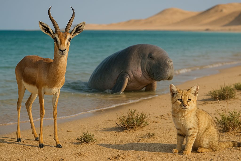 Особую ценность имеют дюгонь, редкий морской травоядный млекопитающий, и песчаная кошка, идеально приспособившаяся к жизни в аридных условиях.