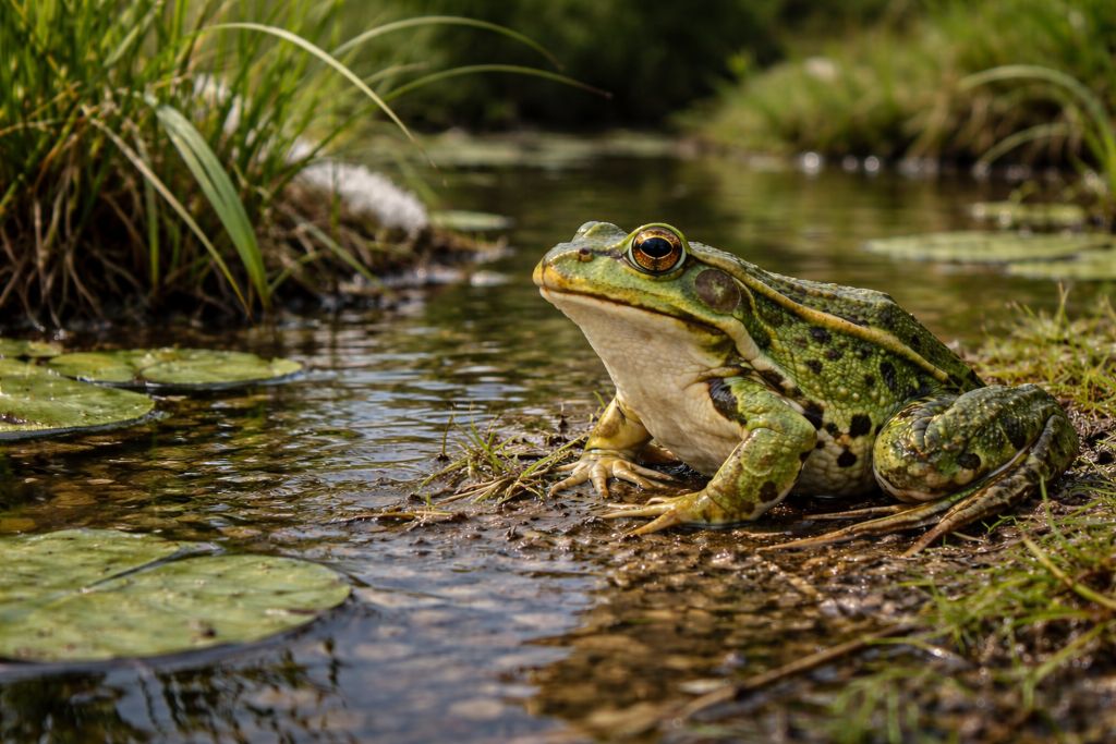 Прудовая лягушка — «эксперт» по мелким, тёплым и спокойным водоёмам, где она успешно охотится и размножается. При этом она заметно страдает от загрязнения и деградации малых вод, поэтому её численность может служить простым индикатором качества среды.
