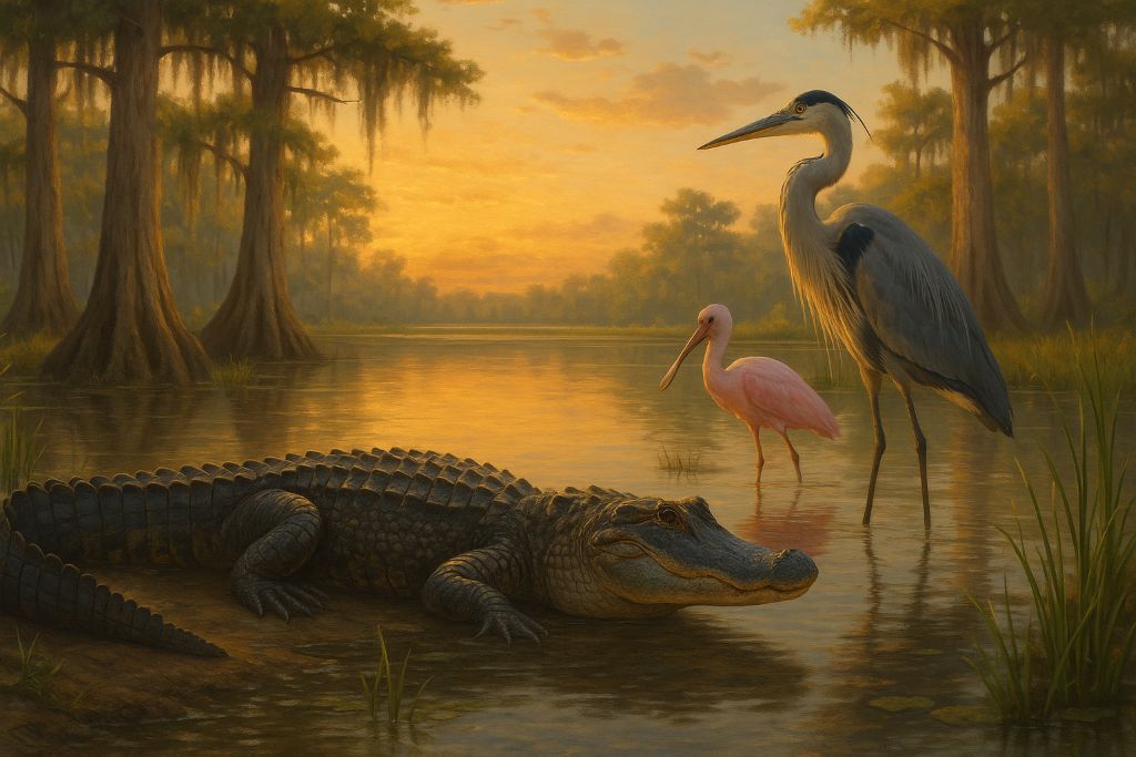 Луизиана — это царство воды и жизни. Здесь каждый вечер наполнен звуками: крики птиц, шорохи под водой, хоры лягушек и всплески рыбы. Аллигаторы охраняют свои болота, цапли грациозно шагают по мелководью, а над всем этим раскидывается тёплое южное небо. Природа Луизианы дикая, яркая и совершенно неповторимая.